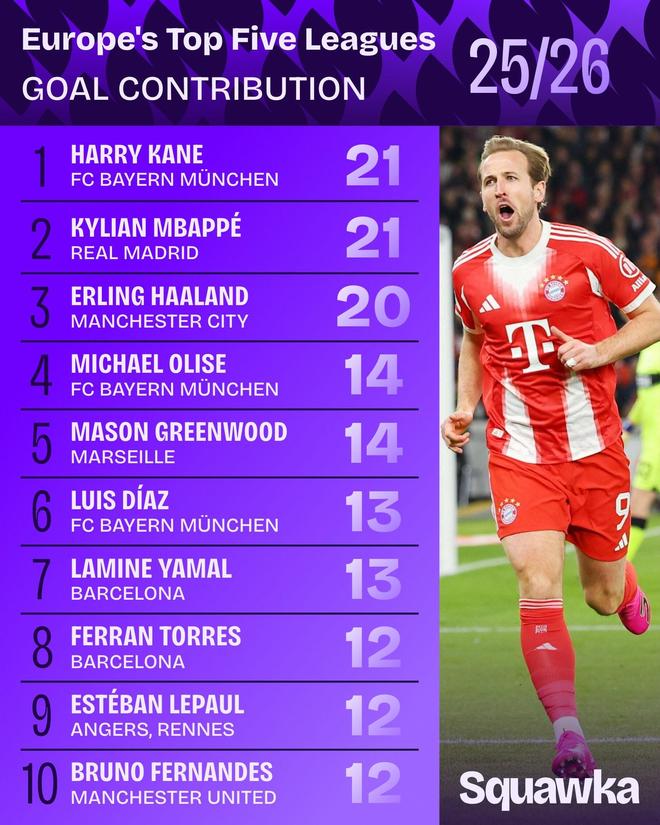 五大联赛本赛季参与进球榜单:凯恩、姆巴佩21球,哈兰德20球