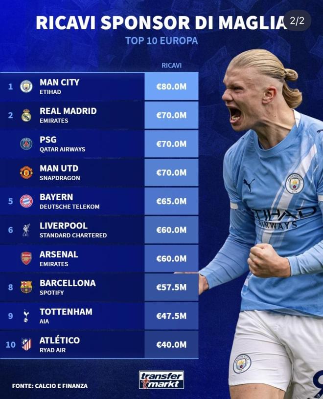 最近意大利媒体Calcio e Finanza公布了一份球衣主赞助收入榜,先看意甲TOP10,再对比欧洲TOP10。AC米兰、国际米兰、尤文图斯在联赛里拿着最高的赞助费,却只能勉强达到曼城赞助金额的三分之一左右。曼城、皇马、巴黎、曼联轻松拿到六七千万甚至八千万欧元,意甲豪门和欧洲头部俱乐部之间的商业差距,被这份榜单直接摊开来了。